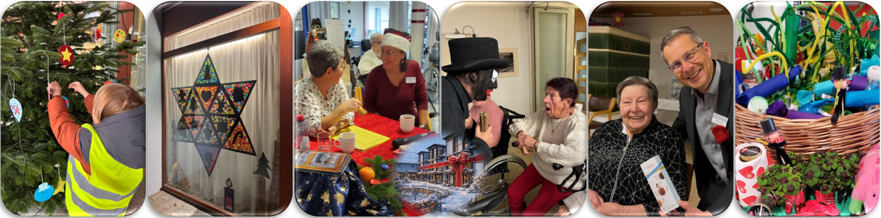 v.l.: Baumschmuck der Kinderkrippe Kimi / Adventsfenster / Samichlaus Kafi / Di Schwarze und di Wiisse / Bewohnerweihnachten / Silvesterfeier