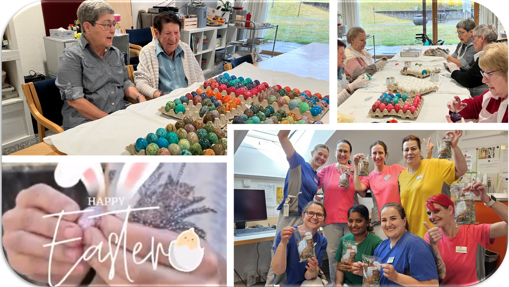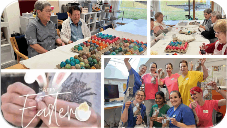 Bereits einige Tage vor Ostern, brachten sich Bewohnende und Mitarbeitende in feierliche Stimmung und über hundert Eier wurden in geselliger Runde gefärbt. Am Gründonnerstag fand das traditionelle „Eier-Tütsche“ als Team-Event statt. Schoggi-Eili-Naschen geht natürlich jeden Tag, egal ob für Jung oder Alt. Am Ostersonntag freuten sich Bewohnende wie auch die Mitarbeitenden im Dienst über die süsse Überraschung. Alles in allem waren es schöne, besinnliche Osterfeiertage begleitet von sensationellem, sonnigen Frühlingswetter.