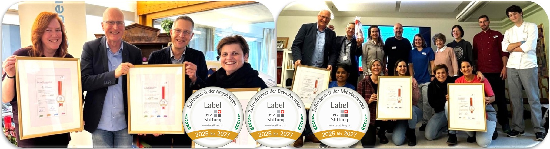 Mit grosser Freude durften wir von der terzStiftung gleich drei Labels entgegennehmen: für die hohe Zufriedenheit unserer Bewohnenden, ihrer Angehörigen und unserer Mitarbeitenden. Besonders stolz sind wir darauf, die Werte von 2022 in allen Bereichen nochmals, teils deutlich übertroffen zu haben.